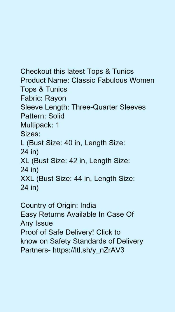Product Name: *Classic Fabulous Women Tops & Tunics*Fabric: RayonSleeve Length: Three-Quarter SleevesPattern: SolidMultipack: 1