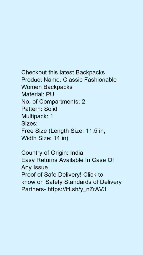 Product Name: *Classic Fashionable Women Backpacks*Material: PUNo. of Compartments: 2Pattern: SolidMultipack: 1