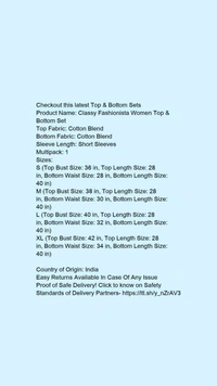 Product Name: *Classy Fashionista Women Top & Bottom Set*Top Fabric: Cotton BlendBottom Fabric: Cotton BlendSleeve Length: Short SleevesMultipack: 1