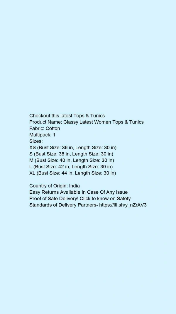 Product Name: *Classy Latest Women Tops & Tunics*Fabric: CottonMultipack: 1