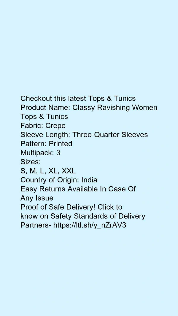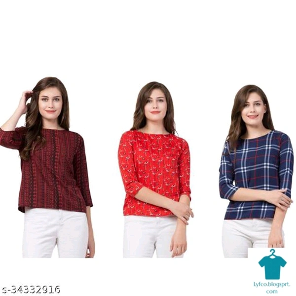 Product Name: *Classy Ravishing Women Tops & Tunics*Fabric: CrepeSleeve Length: Three-Quarter SleevesPattern: PrintedMultipack: 3