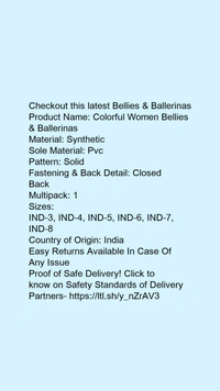 Product Name: *Colorful Women Bellies & Ballerinas*Material: SyntheticSole Material: PvcPattern: SolidFastening & Back Detail: Closed BackMultipack: 1