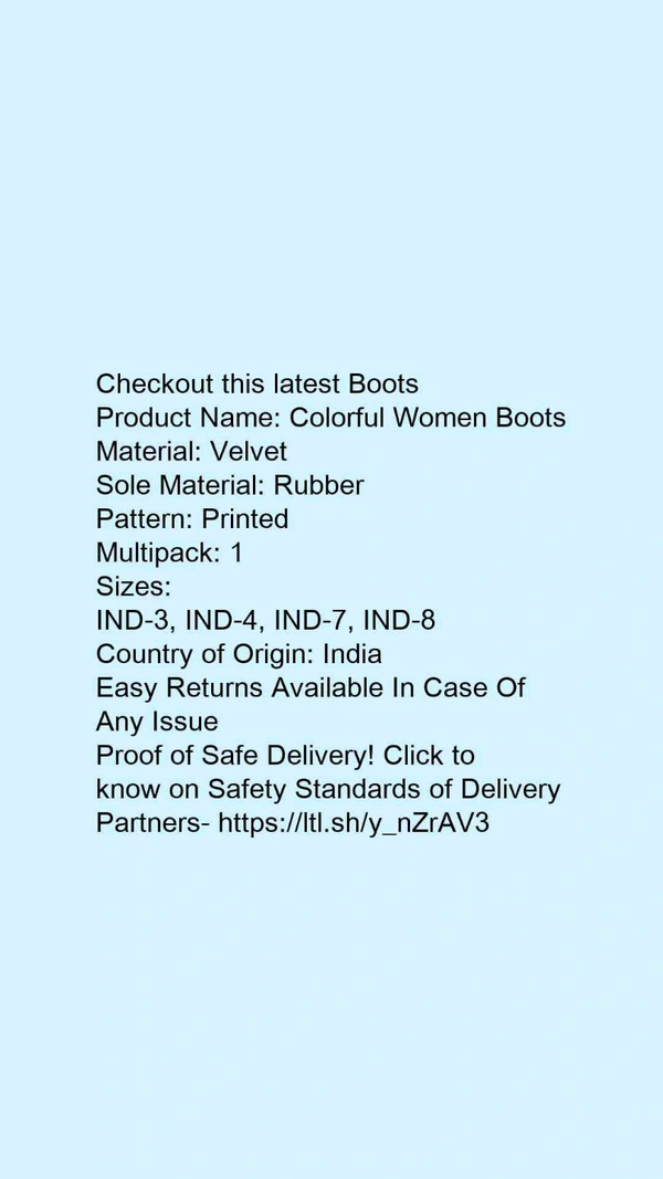 Product Name: *Colorful Women Boots*Material: VelvetSole Material: RubberPattern: PrintedMultipack: 1