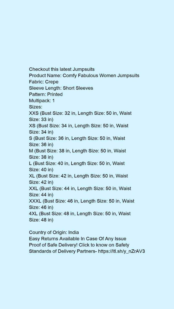 Product Name: *Comfy Fabulous Women Jumpsuits*Fabric: CrepeSleeve Length: Short SleevesPattern: PrintedMultipack: 1