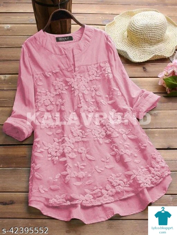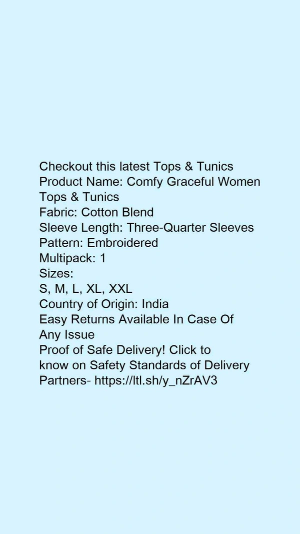 Product Name: *Comfy Graceful Women Tops & Tunics*Fabric: Cotton BlendSleeve Length: Three-Quarter SleevesPattern: EmbroideredMultipack: 1