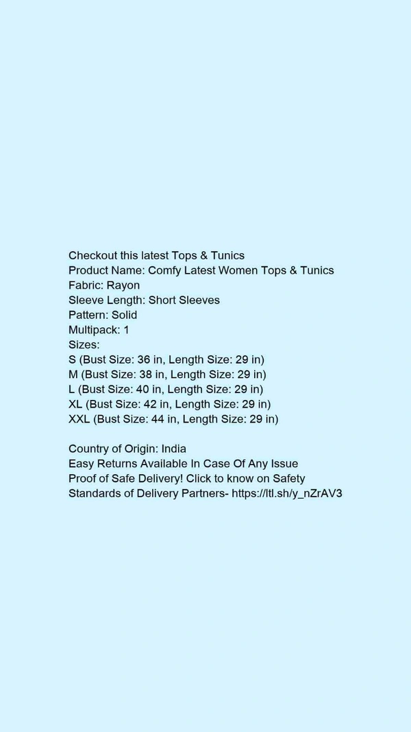 Product Name: *Comfy Latest Women Tops & Tunics*Fabric: RayonSleeve Length: Short SleevesPattern: SolidMultipack: 1