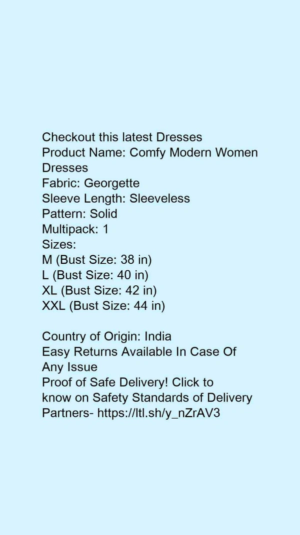 Product Name: *Comfy Modern Women Dresses*Fabric: GeorgetteSleeve Length: SleevelessPattern: SolidMultipack: 1
