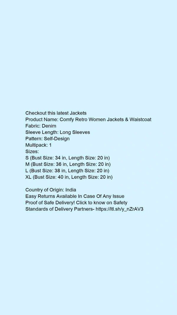Product Name: *Comfy Retro Women Jackets & Waistcoat*Fabric: DenimSleeve Length: Long SleevesPattern: Self-DesignMultipack: 1