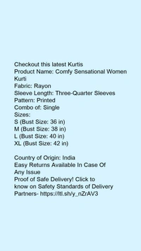 Product Name: *Comfy Sensational Women Kurti*Fabric: RayonSleeve Length: Three-Quarter SleevesPattern: PrintedCombo of: Single