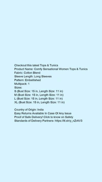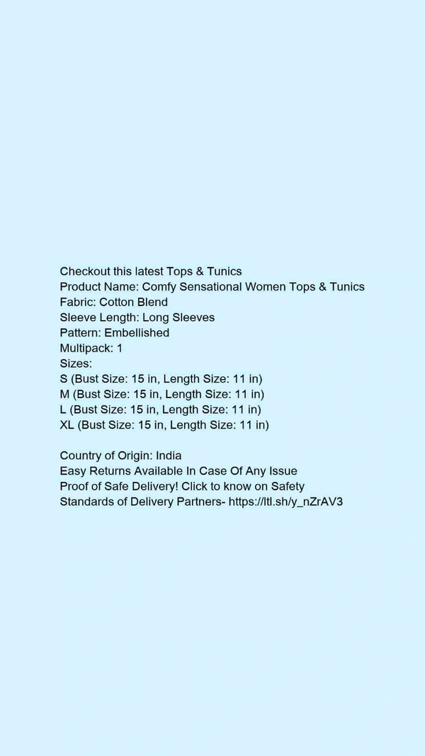 Product Name: *Comfy Sensational Women Tops & Tunics*Fabric: Cotton BlendSleeve Length: Long SleevesPattern: EmbellishedMultipack: 1