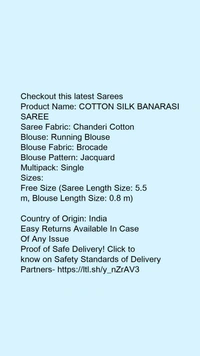 Product Name: *COTTON SILK BANARASI SAREE*Saree Fabric: Chanderi CottonBlouse: Running BlouseBlouse Fabric: BrocadeBlouse Pattern: JacquardMultipack: Single