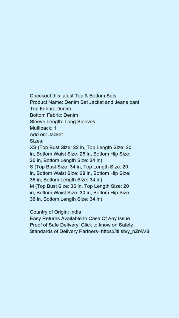Product Name: *Denim Set Jacket and Jeans pant*Top Fabric: DenimBottom Fabric: DenimSleeve Length: Long SleevesMultipack: 1