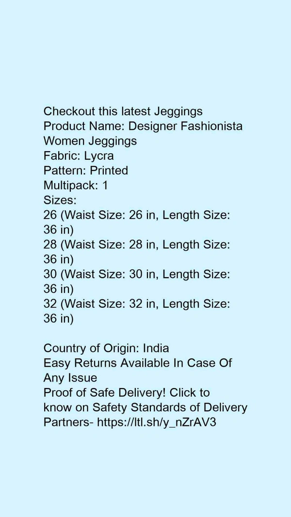 Product Name: *Designer Fashionista Women Jeggings*Fabric: LycraPattern: PrintedMultipack: 1