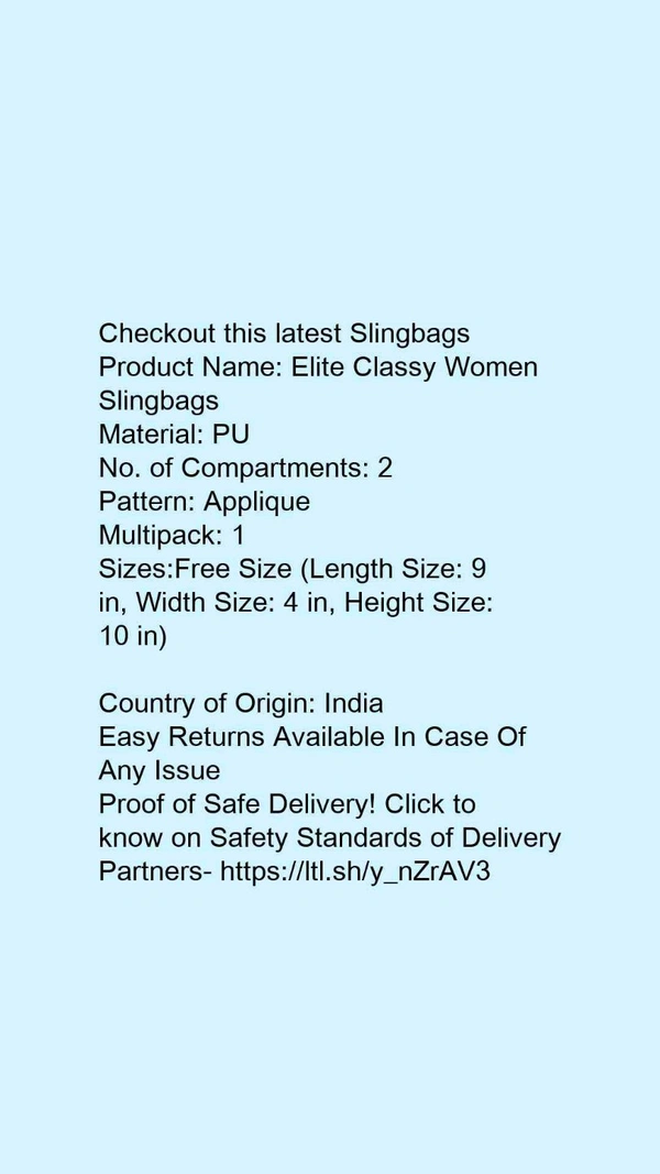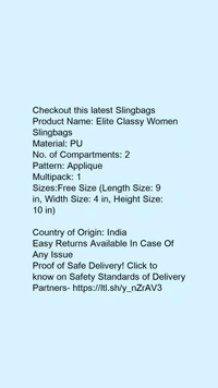 Product Name: *Elite Classy Women Slingbags*Material: PUNo. of Compartments: 2Pattern: AppliqueMultipack: 1