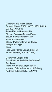 Product Name: *EXCLUSIVE LITCHI SILK SAREE ( GAJRI )*Saree Fabric: Banarasi SilkBlouse: Separate Blouse PieceBlouse Fabric: Banarasi SilkPattern: Zari WovenBlouse Pattern: Same as BorderMultipack: Single