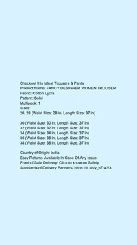 Product Name: *FANCY DESIGNER WOMEN TROUSER *Fabric: Cotton LycraPattern: SolidMultipack: 1