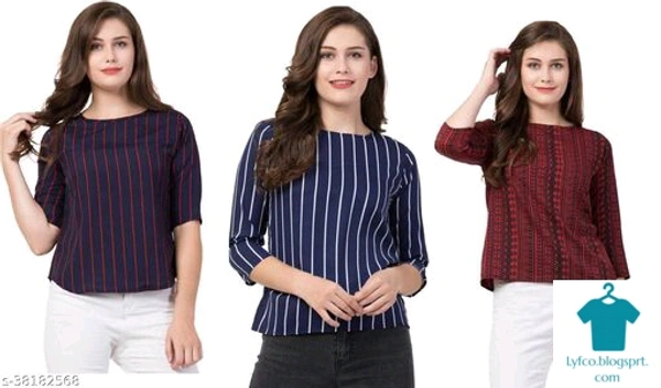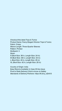 Product Name: *Fancy Elegant Women Tops & Tunics*Fabric: CrepeSleeve Length: Three-Quarter SleevesPattern: PrintedMultipack: 3