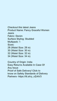 Product Name: *Fancy Graceful Women Jeans*Fabric: DenimSurface Styling: StuddedMultipack: 1