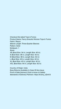 Product Name: *Fancy Graceful Women Tops & Tunics*Fabric: RayonSleeve Length: Three-Quarter SleevesPattern: SolidMultipack: 1