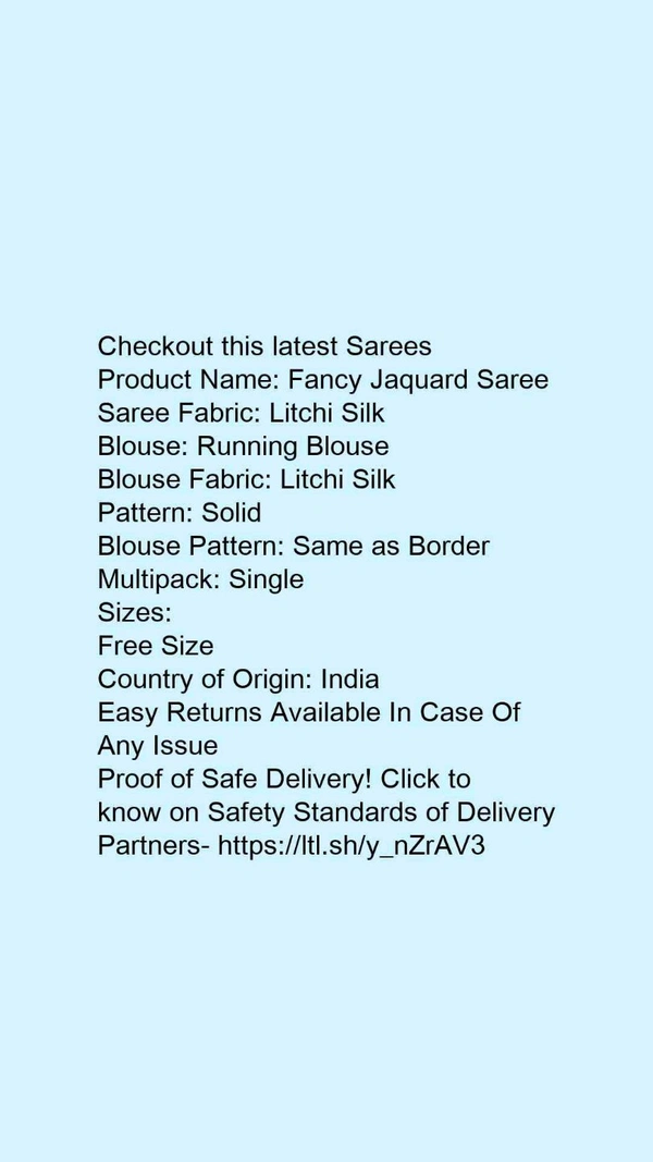 Product Name: *Fancy Jaquard Saree*Saree Fabric: Litchi SilkBlouse: Running BlouseBlouse Fabric: Litchi SilkPattern: SolidBlouse Pattern: Same as BorderMultipack: Single