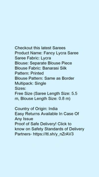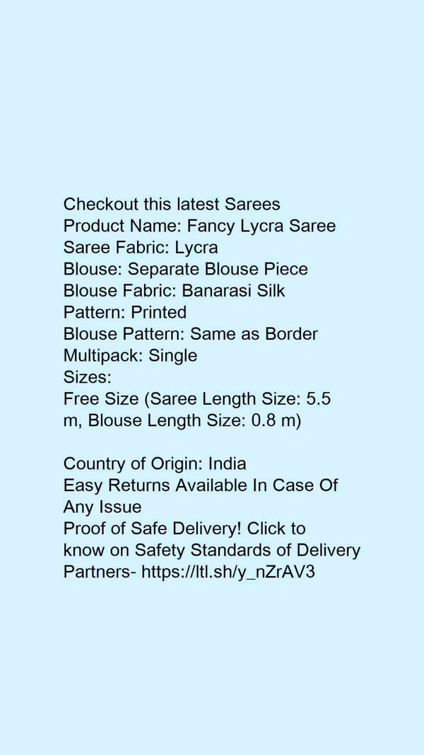 Product Name: *Fancy Lycra Saree*Saree Fabric: LycraBlouse: Separate Blouse PieceBlouse Fabric: Banarasi SilkPattern: PrintedBlouse Pattern: EmbellishedMultipack: Single