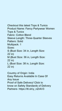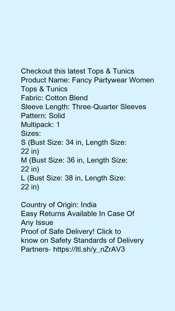 Product Name: *Fancy Partywear Women Tops & Tunics*Fabric: Cotton BlendSleeve Length: Three-Quarter SleevesPattern: SolidMultipack: 1