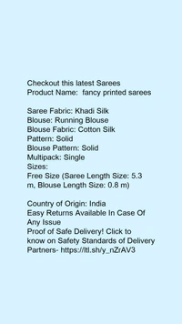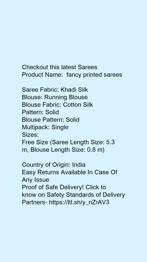 Product Name: * fancy printed sarees *Saree Fabric: Khadi SilkBlouse: Running BlouseBlouse Fabric: Cotton SilkPattern: SolidBlouse Pattern: SolidMultipack: Single
