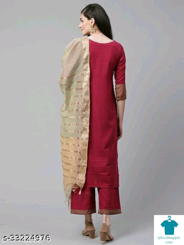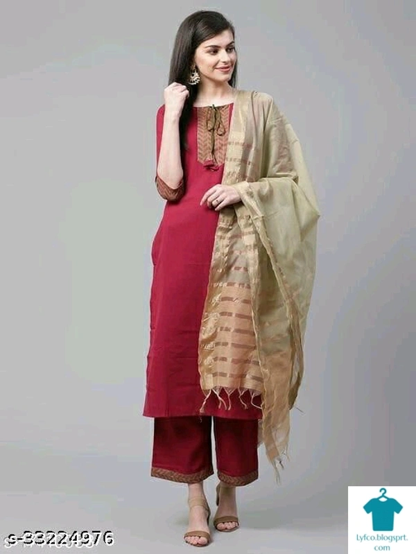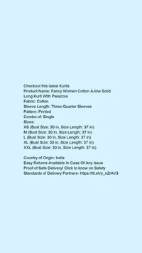 Product Name: *Fancy Women Cotton A-line Solid Long Kurti With Palazzos*Fabric: CottonSleeve Length: Three-Quarter SleevesPattern: PrintedCombo of: Single