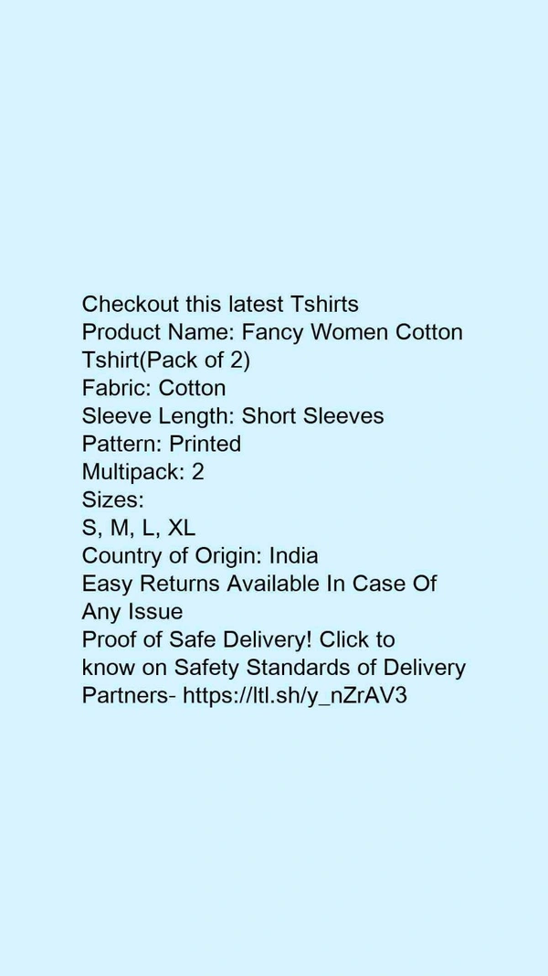 Product Name: *Fancy Women Cotton Tshirt(Pack of 2)*Fabric: CottonSleeve Length: Short SleevesPattern: PrintedMultipack: 2