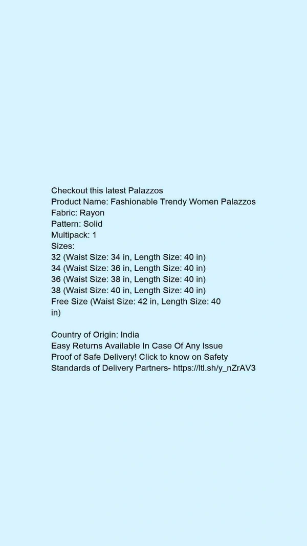 Product Name: *Fashionable Trendy Women Palazzos*Fabric: RayonPattern: SolidMultipack: 1