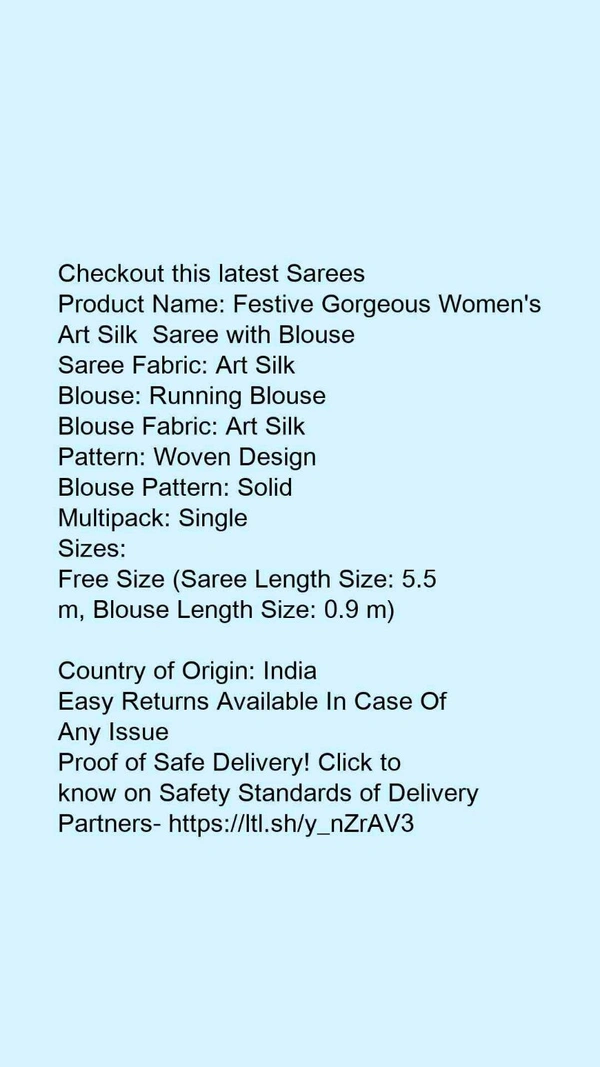 Product Name: *Festive Gorgeous Women's Art Silk Saree with Blouse*Saree Fabric: Art SilkBlouse: Running BlouseBlouse Fabric: Art SilkPattern: Woven DesignBlouse Pattern: SolidMultipack: Single