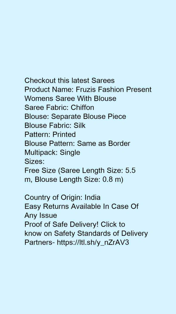 Product Name: *Fruzis Fashion Present Womens Saree With Blouse*Saree Fabric: ChiffonBlouse: Separate Blouse PieceBlouse Fabric: SilkPattern: PrintedBlouse Pattern: Same as BorderMultipack: Single