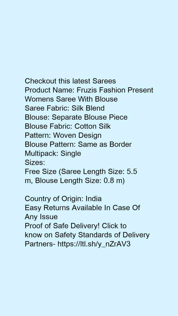 Product Name: *Fruzis Fashion Present Womens Saree With Blouse*Saree Fabric: ChiffonBlouse: Separate Blouse PieceBlouse Fabric: SilkPattern: PrintedBlouse Pattern: Same as BorderMultipack: Single