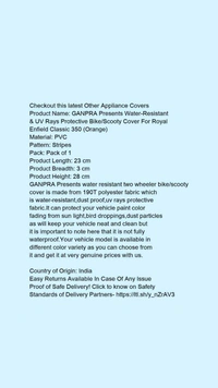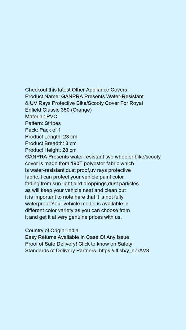 Product Name: *GANPRA Presents Water-Resistant & UV Rays Protective Bike/Scooty Cover For Royal Enfield Classic 350 (Orange)*Material: PVCPattern: StripesPack: Pack of 1Product Length: 23 cmProduct Breadth: 3 cmProduct Height: 28 cmGANPRA Presents water resistant two wheeler bike/scooty cover is made from 190T polyester fabric which is water-resistant,dust proof,uv rays protective