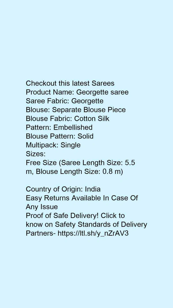 Product Name: *Georgette saree*Saree Fabric: GeorgetteBlouse: Separate Blouse PieceBlouse Fabric: Cotton SilkPattern: EmbellishedBlouse Pattern: SolidMultipack: Single