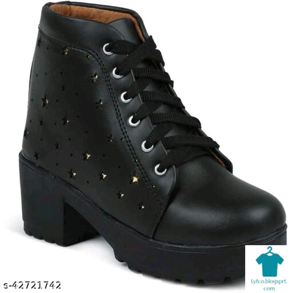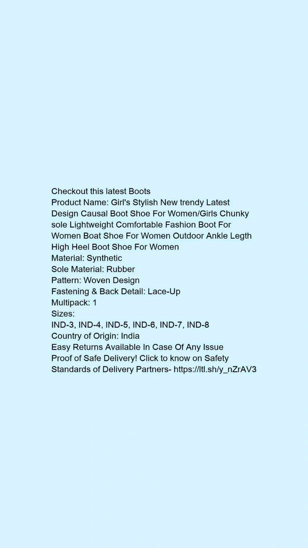 Product Name: *Girl's Stylish New trendy Latest Design Causal Boot Shoe For Women/Girls Chunky sole Lightweight Comfortable Fashion Boot For Women Boat Shoe For Women Outdoor Ankle Legth High Heel Boot Shoe For Women*Material: SyntheticSole Material: RubberPattern: Woven DesignFastening & Back Detail: Lace-UpMultipack: 1