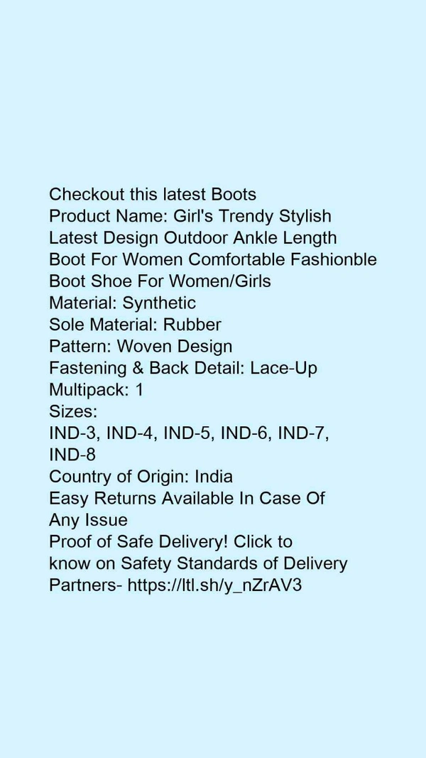 Product Name: *Girl's Trendy Stylish Latest Design Outdoor Ankle Length Boot For Women Comfortable Fashionble Boot Shoe For Women/Girls*Material: SyntheticSole Material: RubberPattern: Woven DesignFastening & Back Detail: Lace-UpMultipack: 1