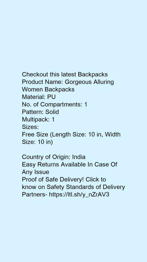 Product Name: *Gorgeous Alluring Women Backpacks*Material: PUNo. of Compartments: 1Pattern: SolidMultipack: 1