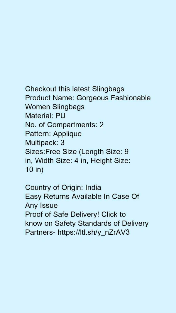 Product Name: *Gorgeous Fashionable Women Slingbags*Material: PUNo. of Compartments: 2Pattern: AppliqueMultipack: 3