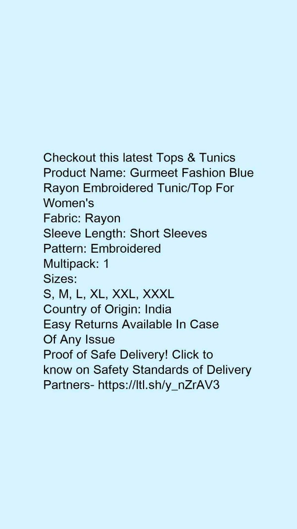 Product Name: *Gurmeet Fashion Black Rayon Embroidered Tunic/Top For Women's*Fabric: RayonSleeve Length: Short SleevesPattern: EmbroideredMultipack: 1