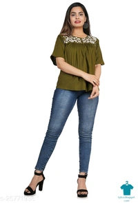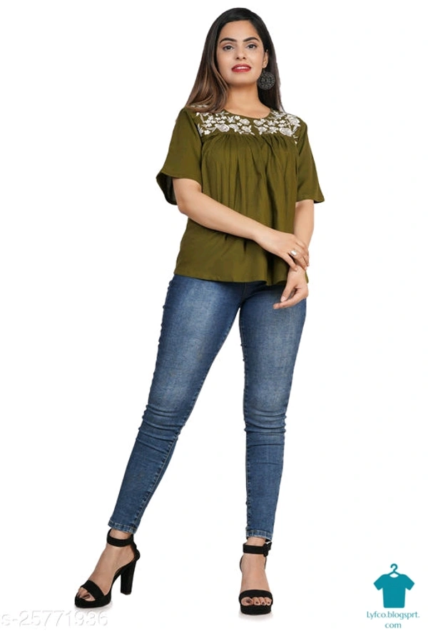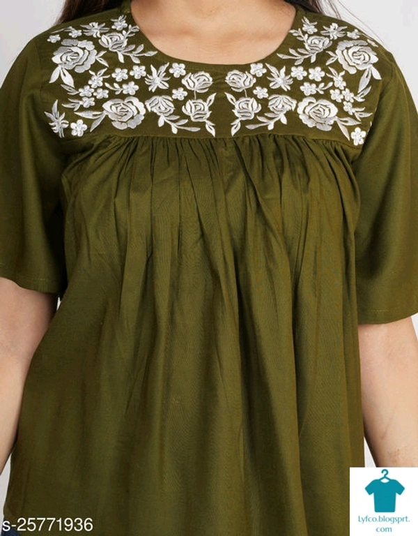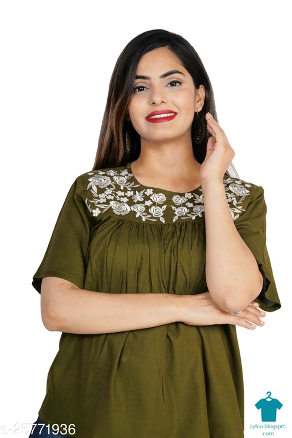 Product Name: *Gurmeet Fashion Green Rayon Embroidered Tunic/Top For Women's*Fabric: RayonSleeve Length: Short SleevesPattern: EmbroideredMultipack: 1
