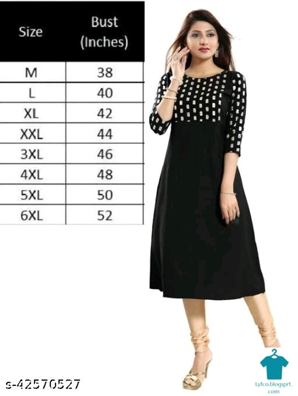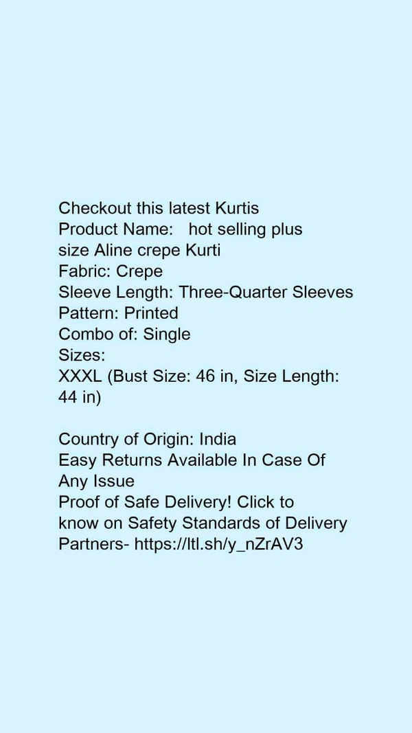 Product Name: * hot selling plus size Aline crepe Kurti*Fabric: CrepeSleeve Length: Three-Quarter SleevesPattern: PrintedCombo of: Single