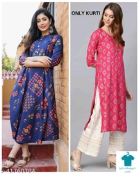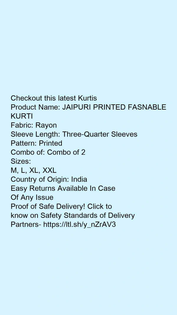 Product Name: *JAIPURI PRINTED FASNABLE KURTI*Fabric: RayonSleeve Length: Three-Quarter SleevesPattern: PrintedCombo of: Combo of 2