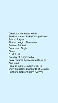 Product Name: *Jivika Drishya Kurtis*Fabric: RayonSleeve Length: SleevelessPattern: PrintedCombo of: Single