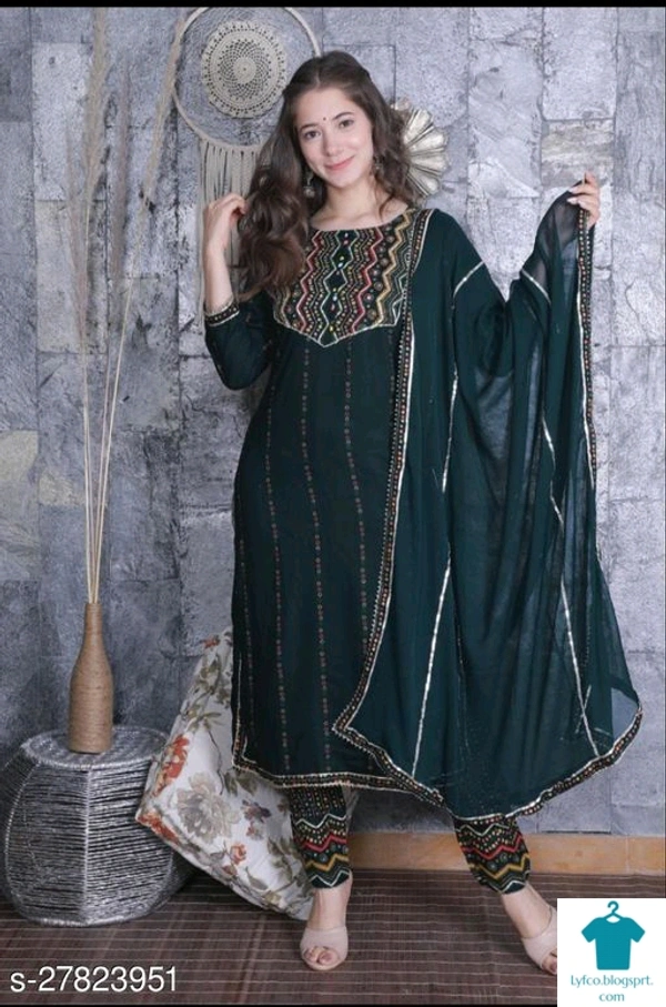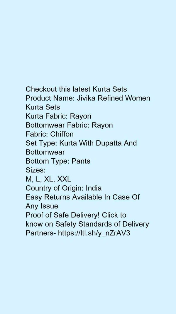 Product Name: *Jivika Refined Women Kurta Sets*Kurta Fabric: RayonBottomwear Fabric: RayonFabric: ChiffonSet Type: Kurta With Dupatta And BottomwearBottom Type: Pants