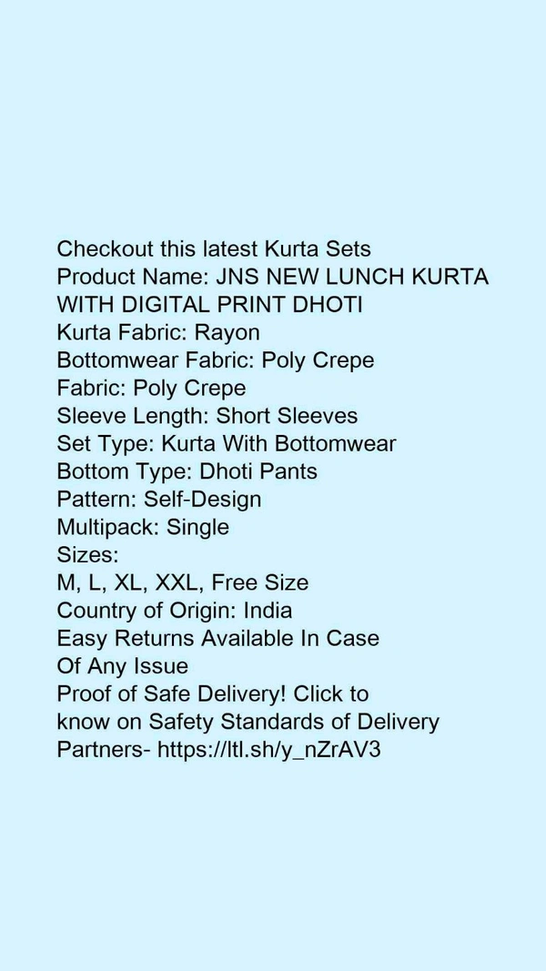 Product Name: *JNS NEW LUNCH KURTA WITH DIGITAL PRINT DHOTI*Kurta Fabric: Rayon