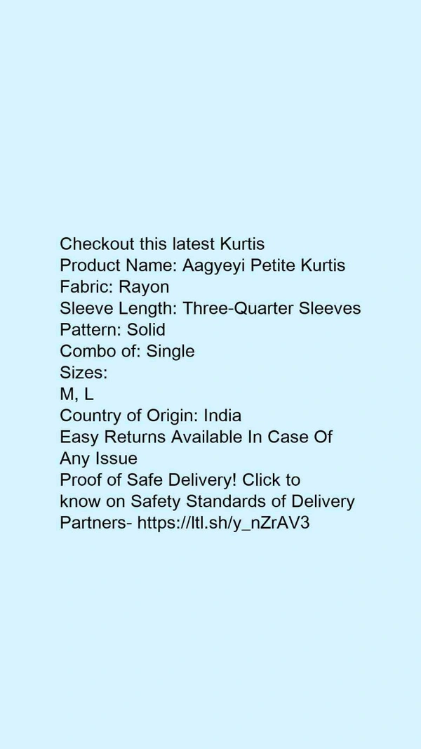 Product Name: *Kashvi Graceful Kurtis*Fabric: RayonSleeve Length: Three-Quarter SleevesPattern: SolidCombo of: Single