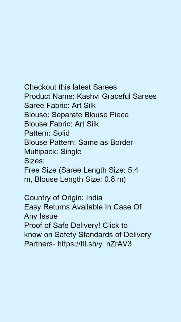 Product Name: *Kashvi Graceful Sarees*Saree Fabric: Art SilkBlouse: Separate Blouse PieceBlouse Fabric: Art SilkPattern: SolidBlouse Pattern: Same as BorderMultipack: Single