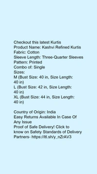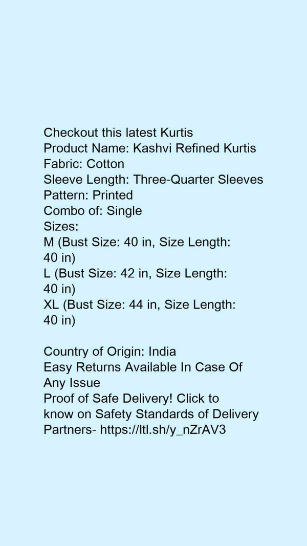Product Name: *Kashvi Refined Kurtis*Fabric: CottonSleeve Length: Three-Quarter SleevesPattern: PrintedCombo of: Single