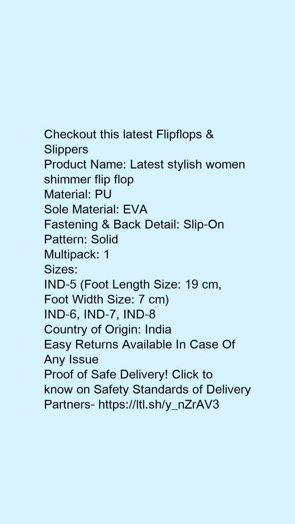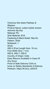 Product Name: *Latest stylish women shimmer flip flop*Material: PUSole Material: EVAFastening & Back Detail: Slip-OnPattern: SolidMultipack: 1